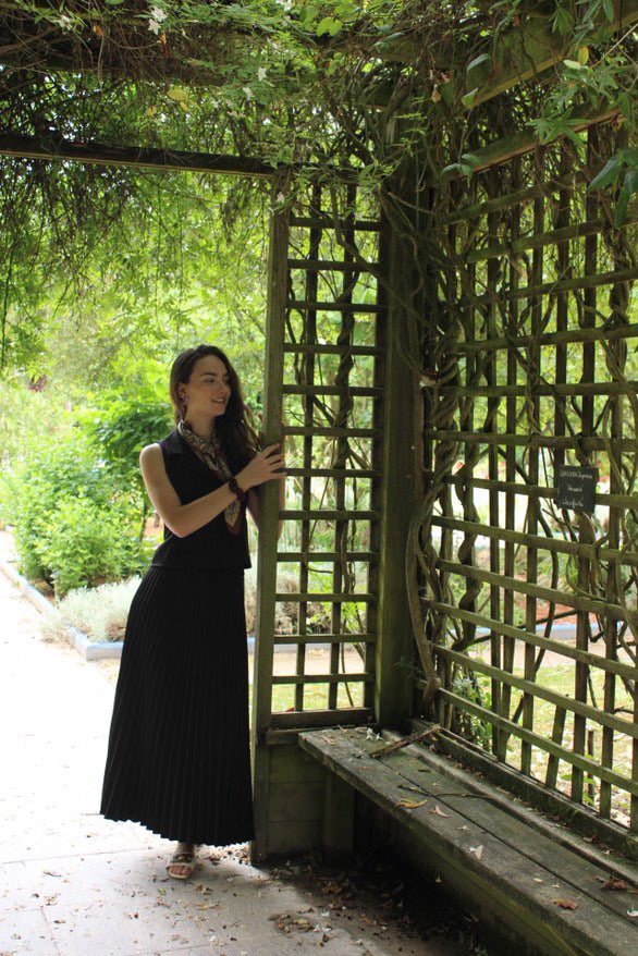 Composé d'un blazer sans manches structuré et d'une jupe longue plissée à la taille élastique, cet ensemble noir offre une silhouette flatteuse et confortable pour toutes les morphologies ( d'un 34 à un 42).